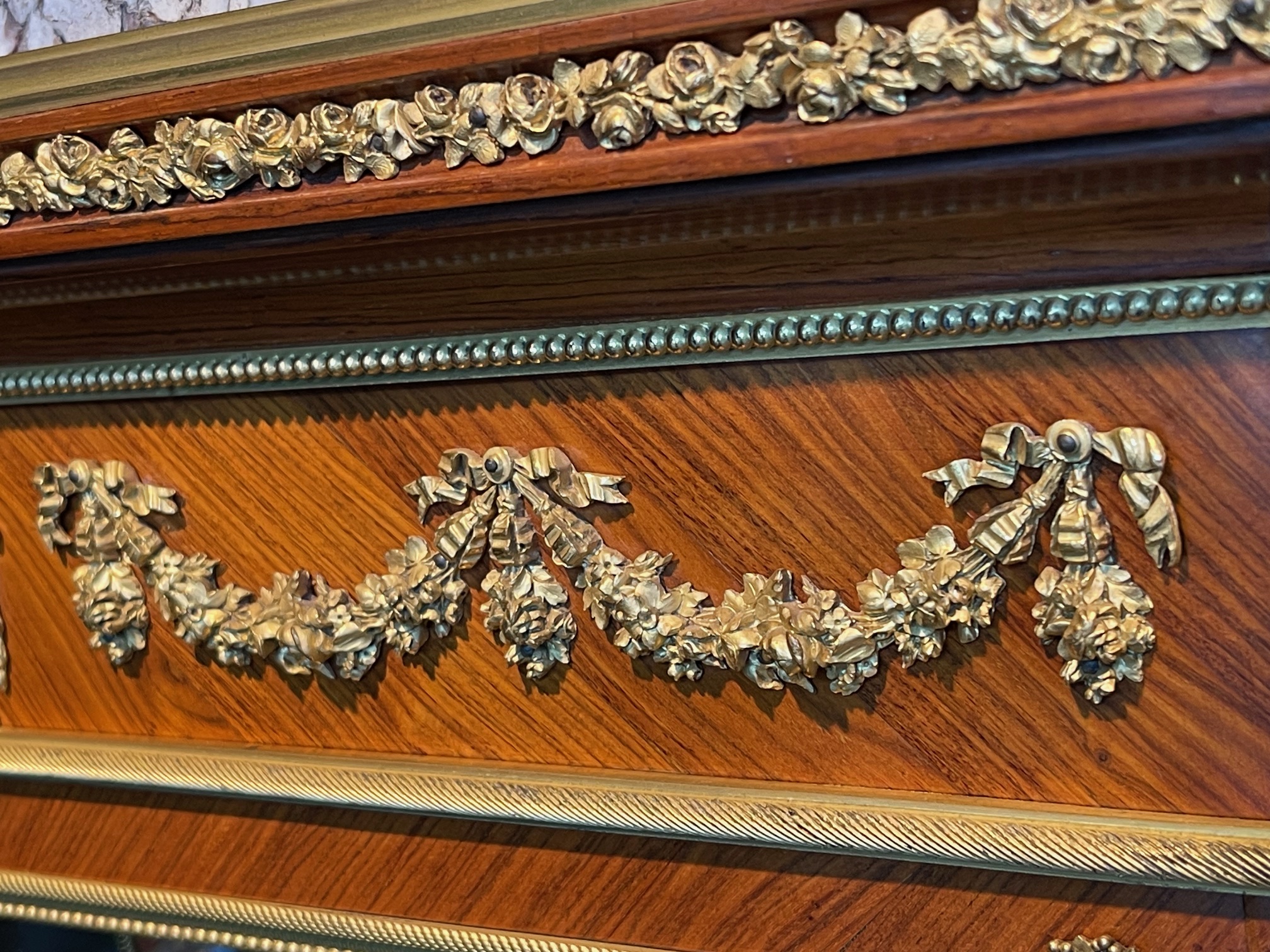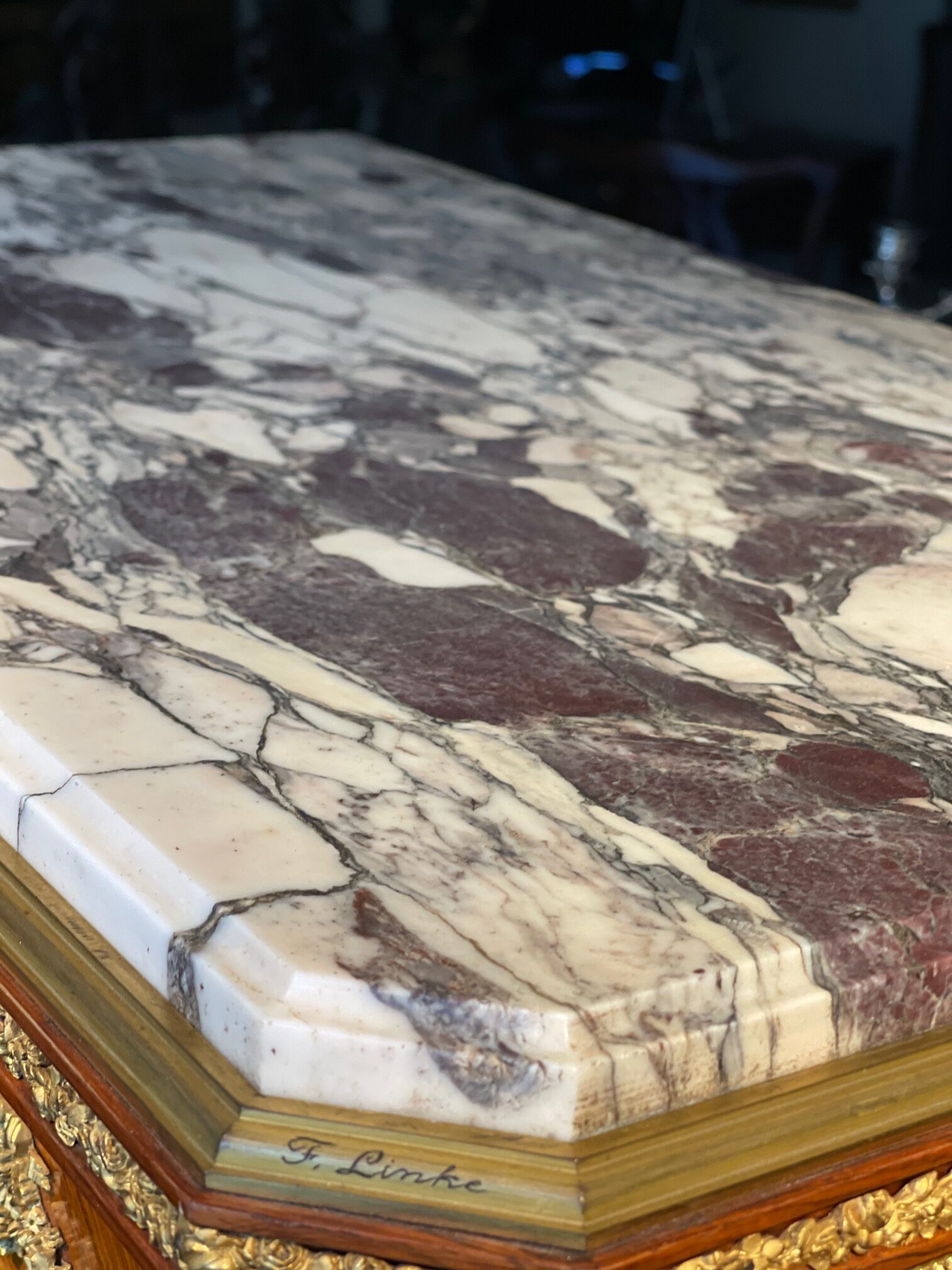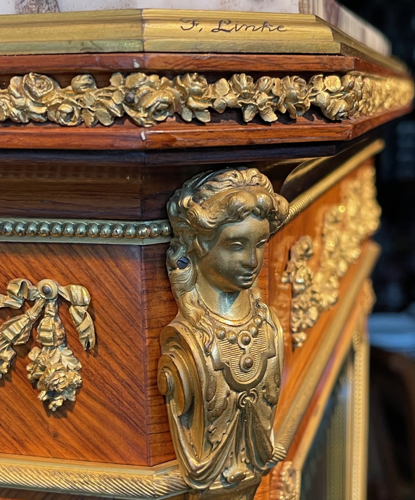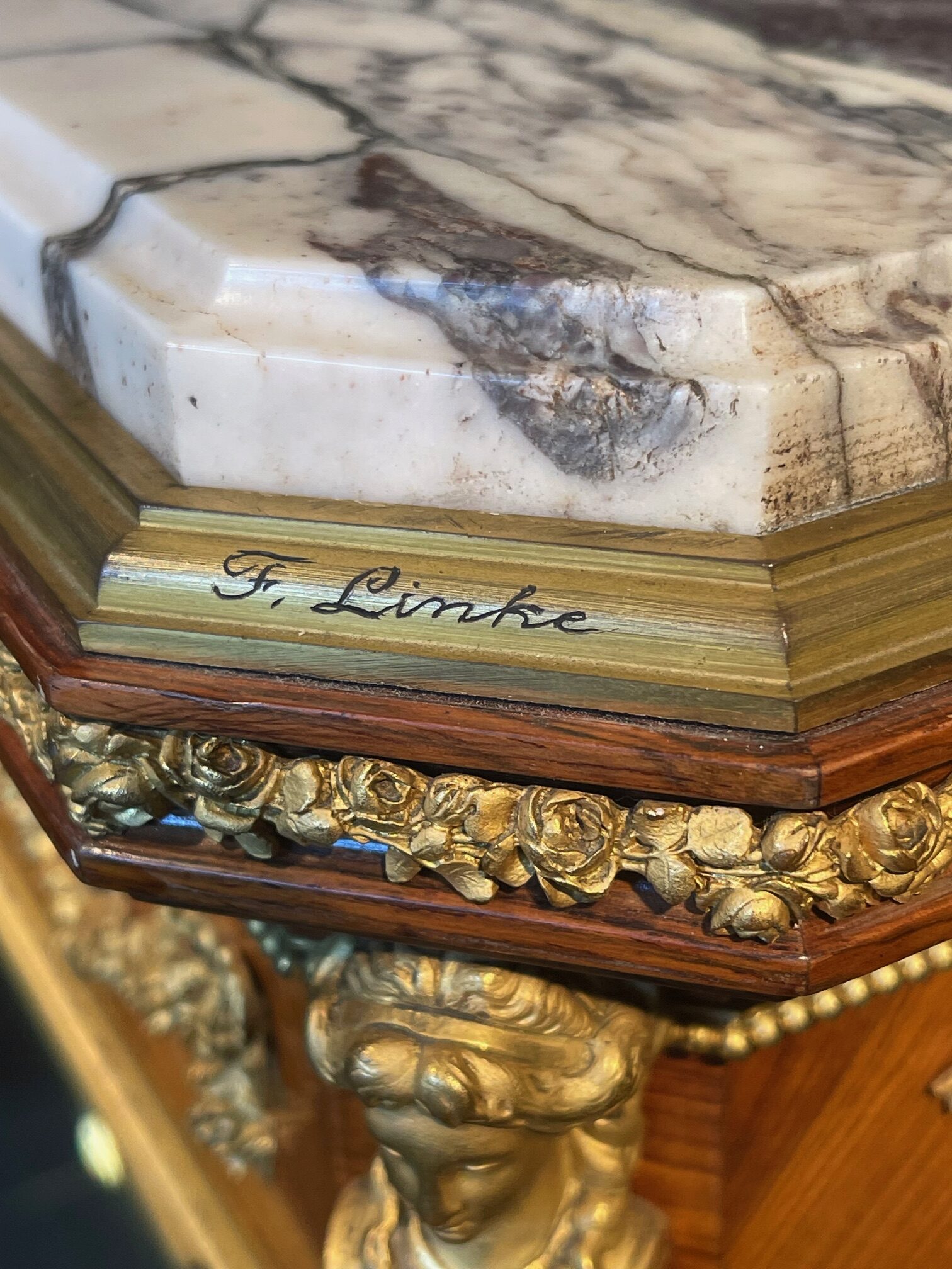 Κατασκευασμένη στο Παρίσι γύρω στο 1890 από kingwood, με επιχρυσωμένα μπρούντζινα διακοσμητικά (ormolu), και επιφάνεια από μάρμαρο Brèche Violette. Οι κομψές γραμμές, η μαρμάρινη επιφάνεια και η εκλέπτυνση των λεπτομερειών αναδεικνύουν την δεξιοτεχνία του Linke στη σύζευξη της ροκοκό χάρης με τη φινέτσα της Belle Époque.
